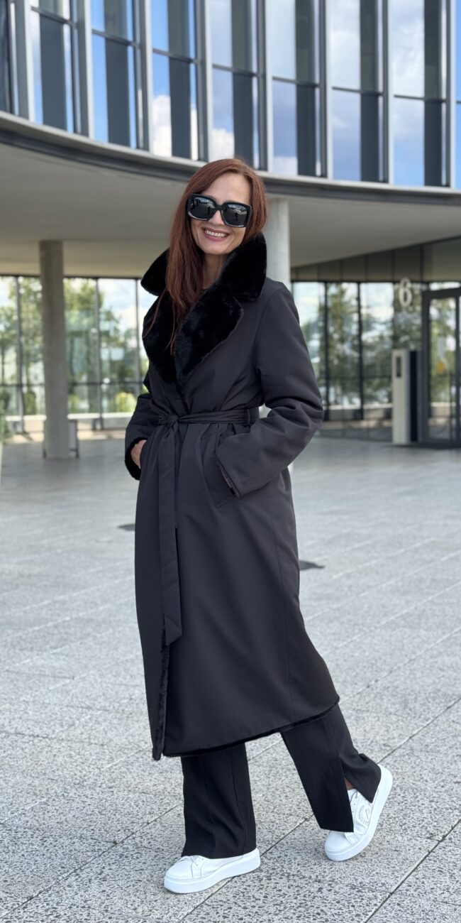 Пальто женское двухстороннее экомех, фактура норка, Модель 69613-2, цвет Черный