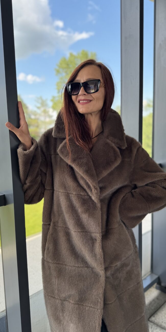 Пальто женское двухстороннее экомех, фактура норка, Модель 69613-2, цвет Кэмел