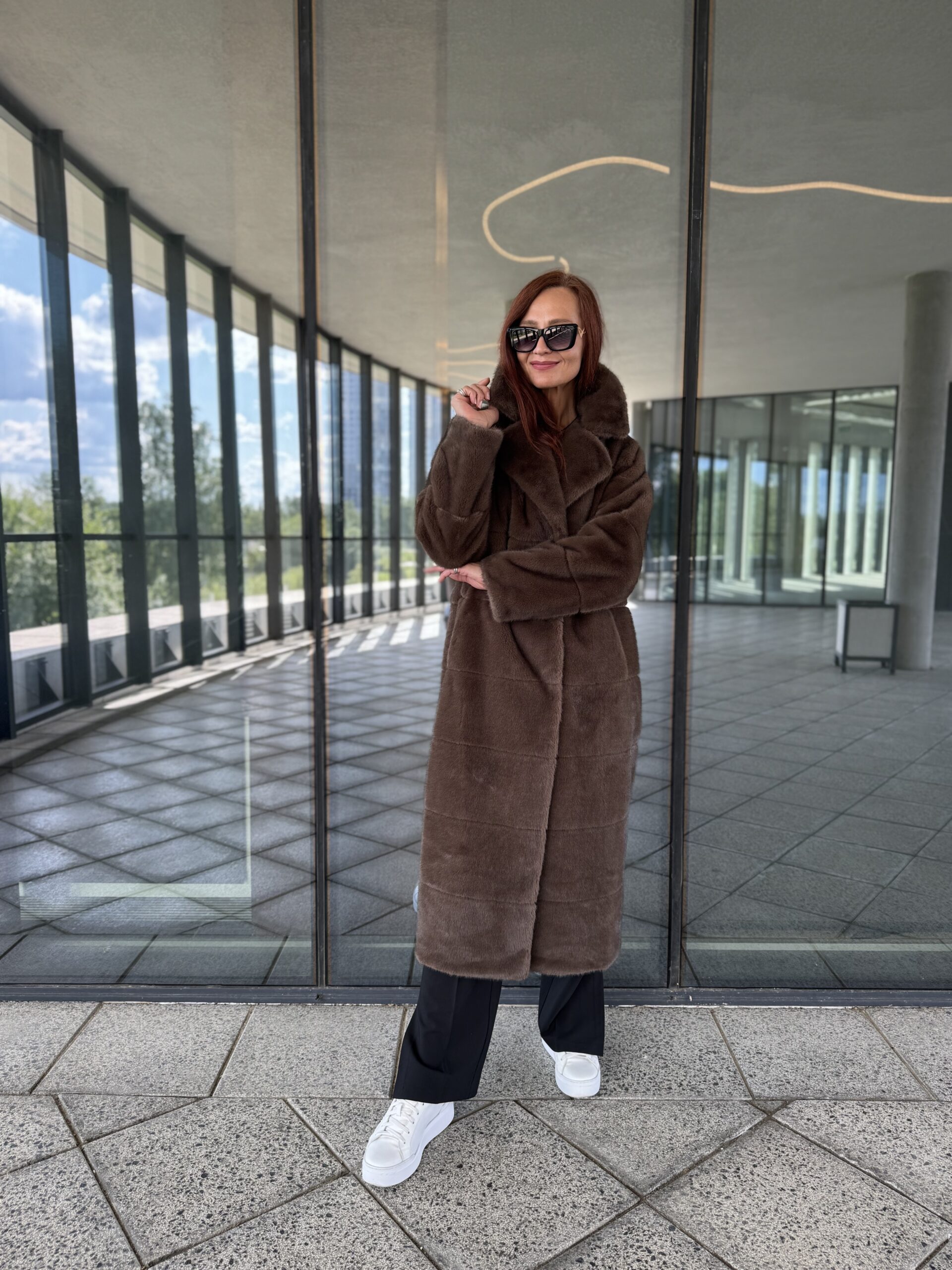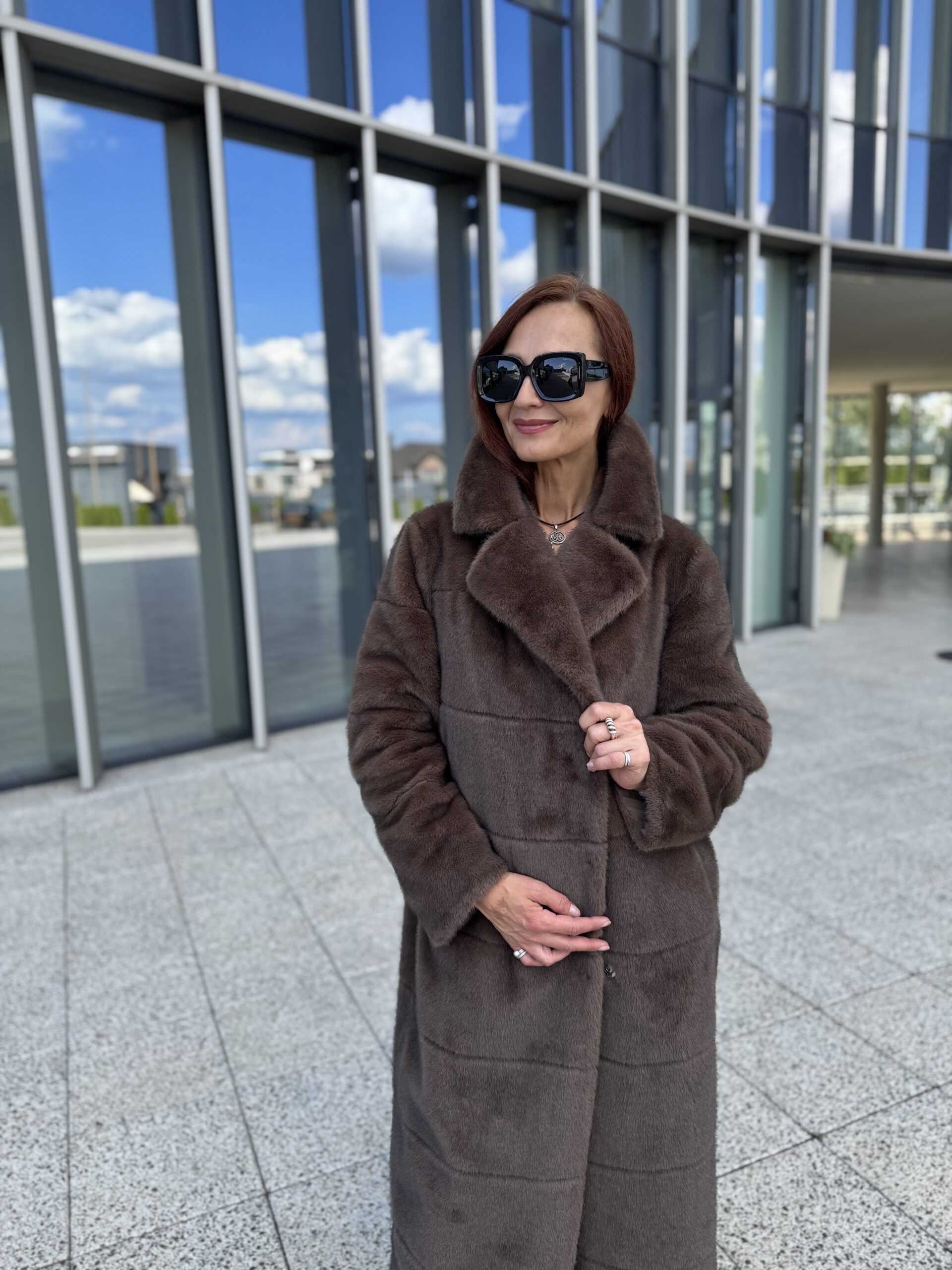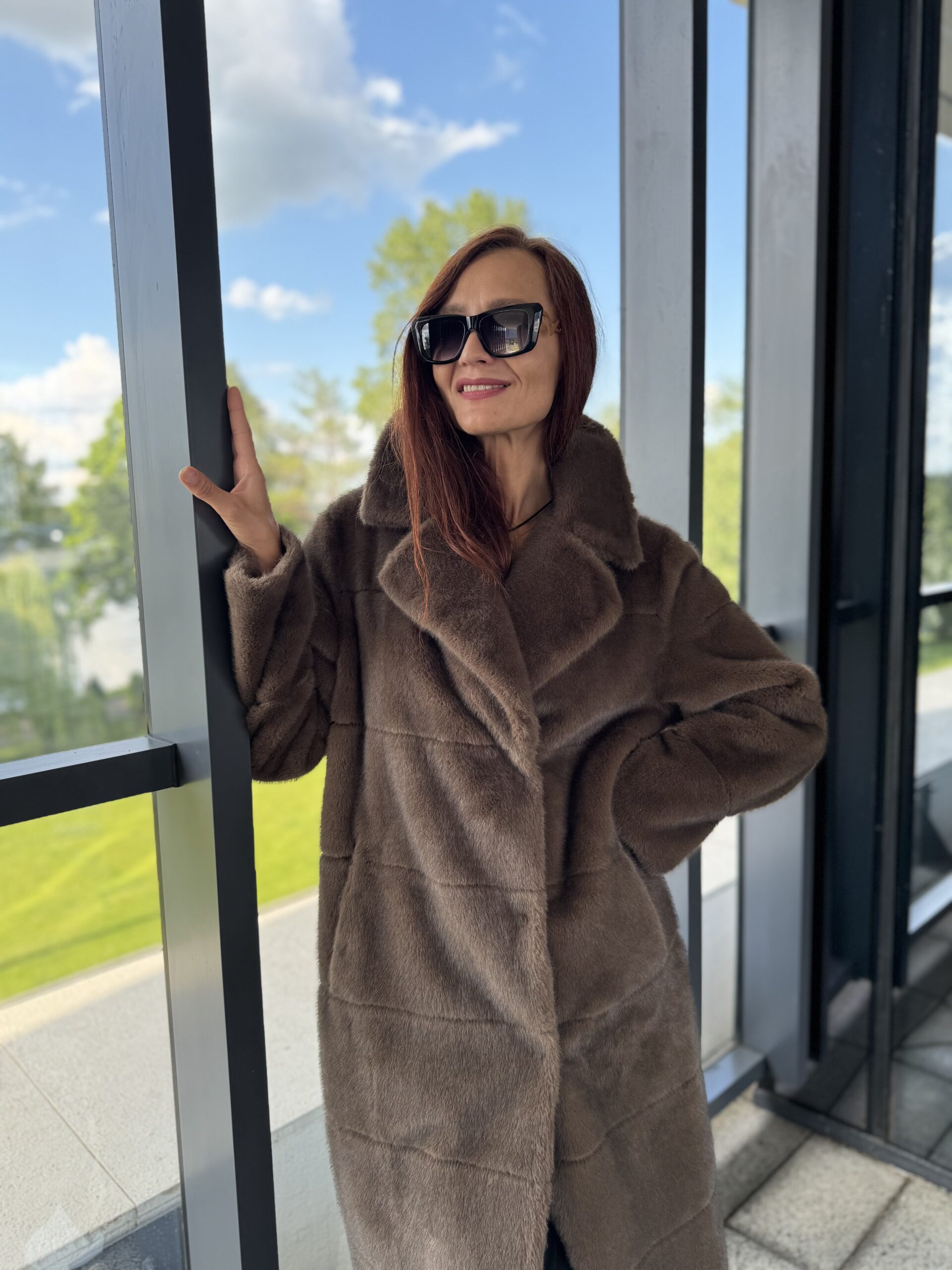 Двустороннее зимнее пальто в шоколадном цвете с двумя разными фактурами материала — экомех, фактура идентичная натуральной норке и водоотталкивающий, плотный ветроустойчивый текстиль 💫     Цвет: шоколад Длина 120 см. Состав: одна сторона 100% полиэстер, вторая сторона водоотталкивающая плащевая ткань Производство Россия