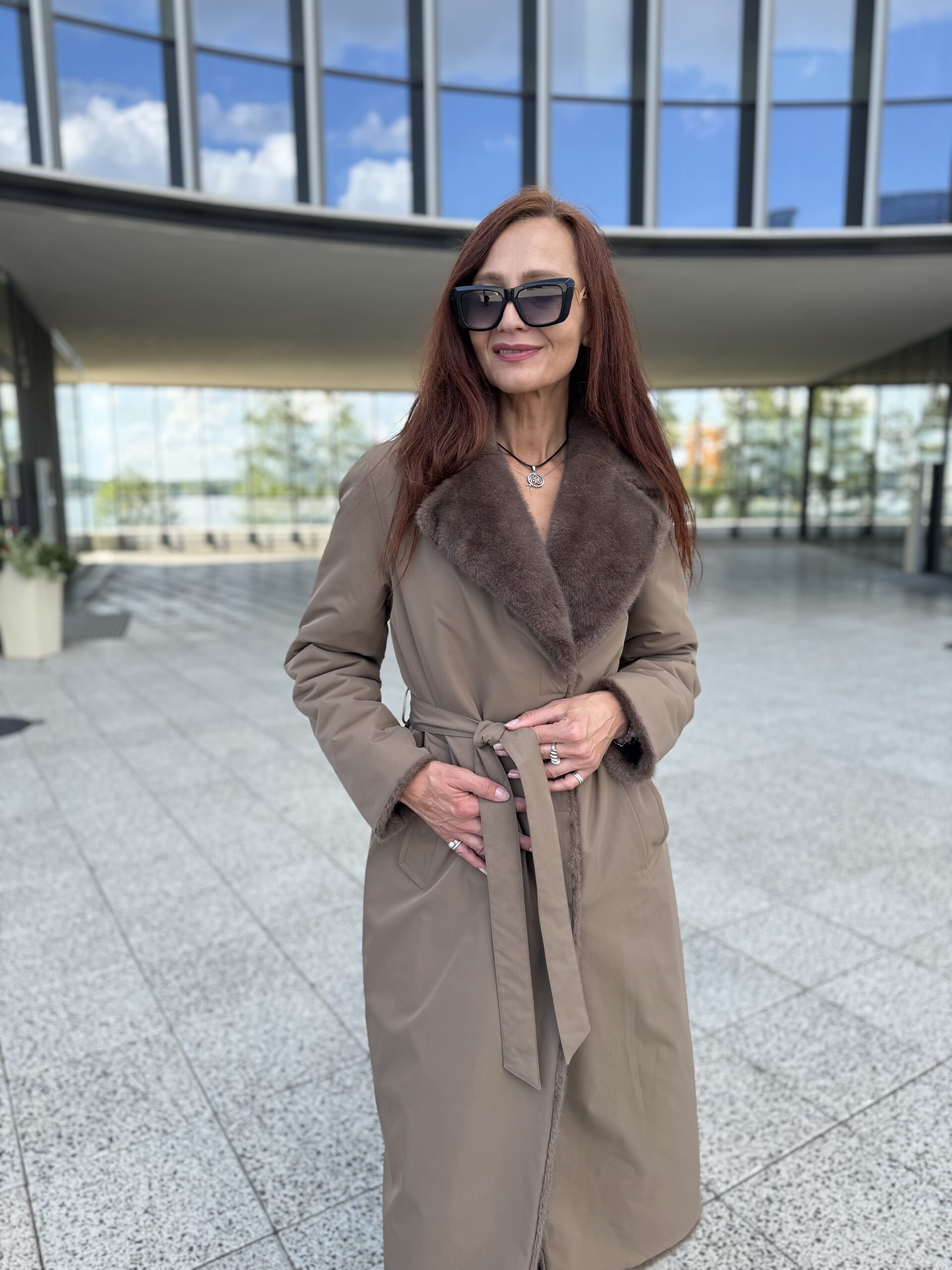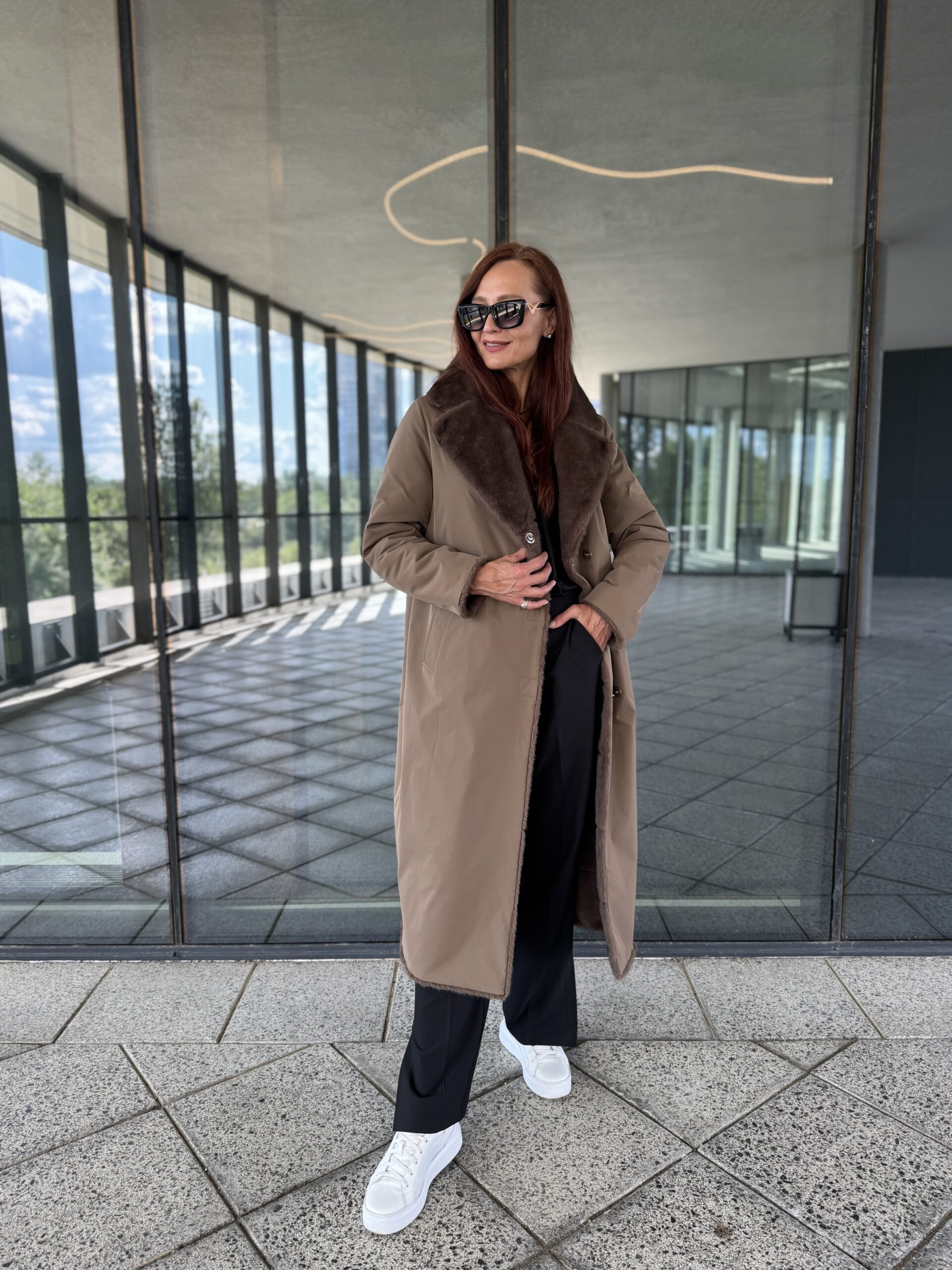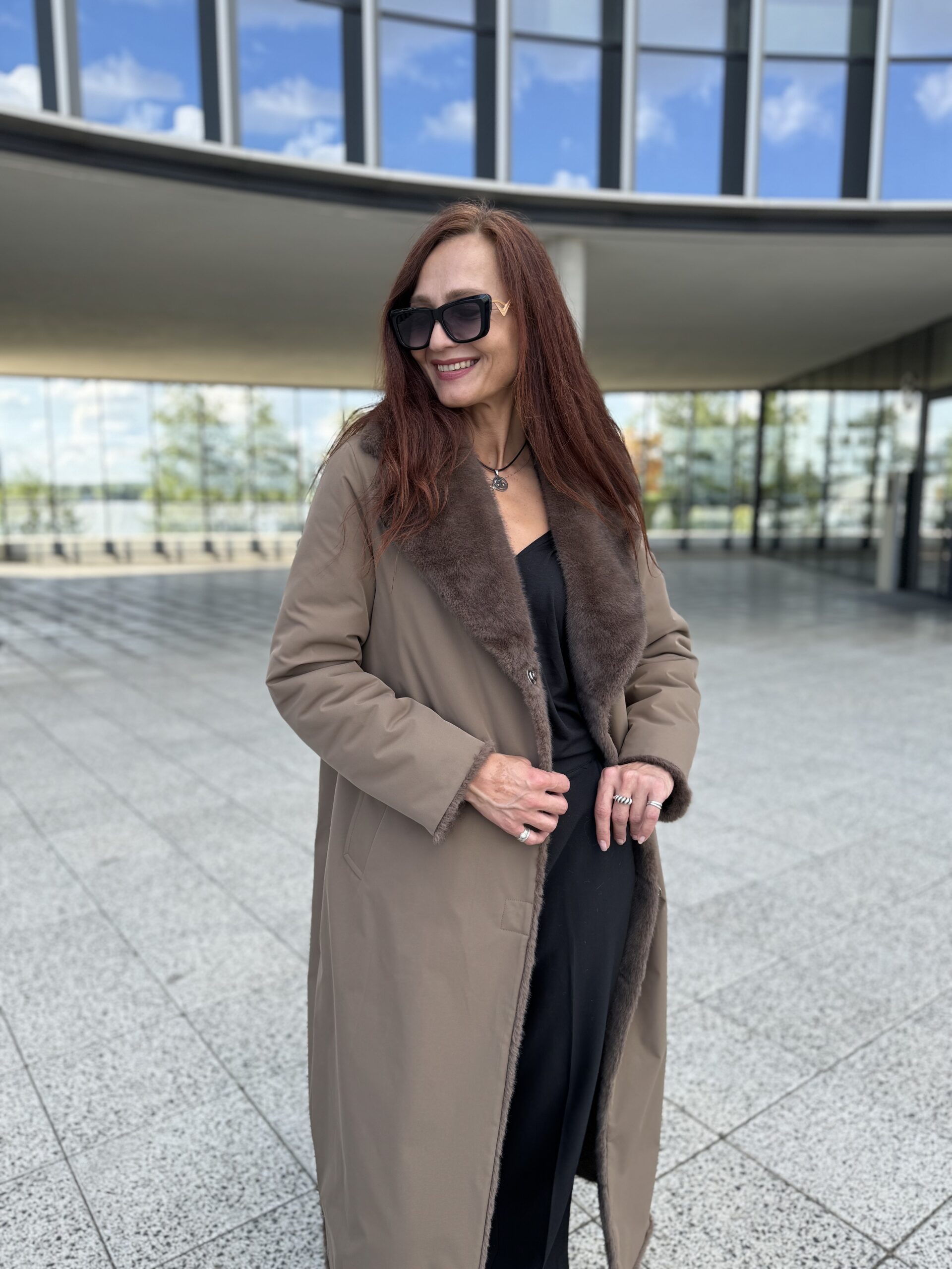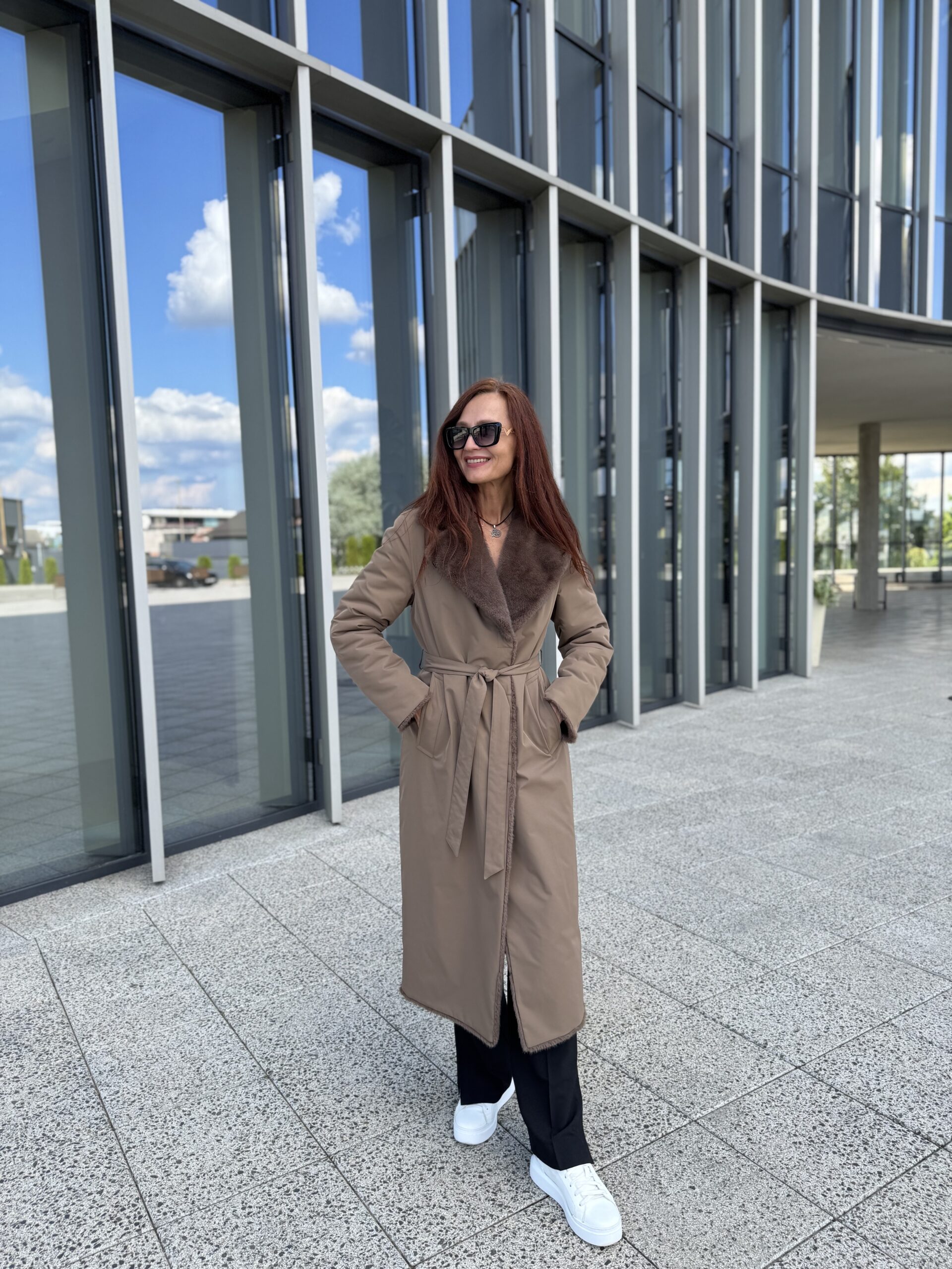 Двустороннее зимнее пальто в шоколадном цвете с двумя разными фактурами материала — экомех, фактура идентичная натуральной норке и водоотталкивающий, плотный ветроустойчивый текстиль 💫     Цвет: шоколад Длина 120 см. Состав: одна сторона 100% полиэстер, вторая сторона водоотталкивающая плащевая ткань Производство Россия