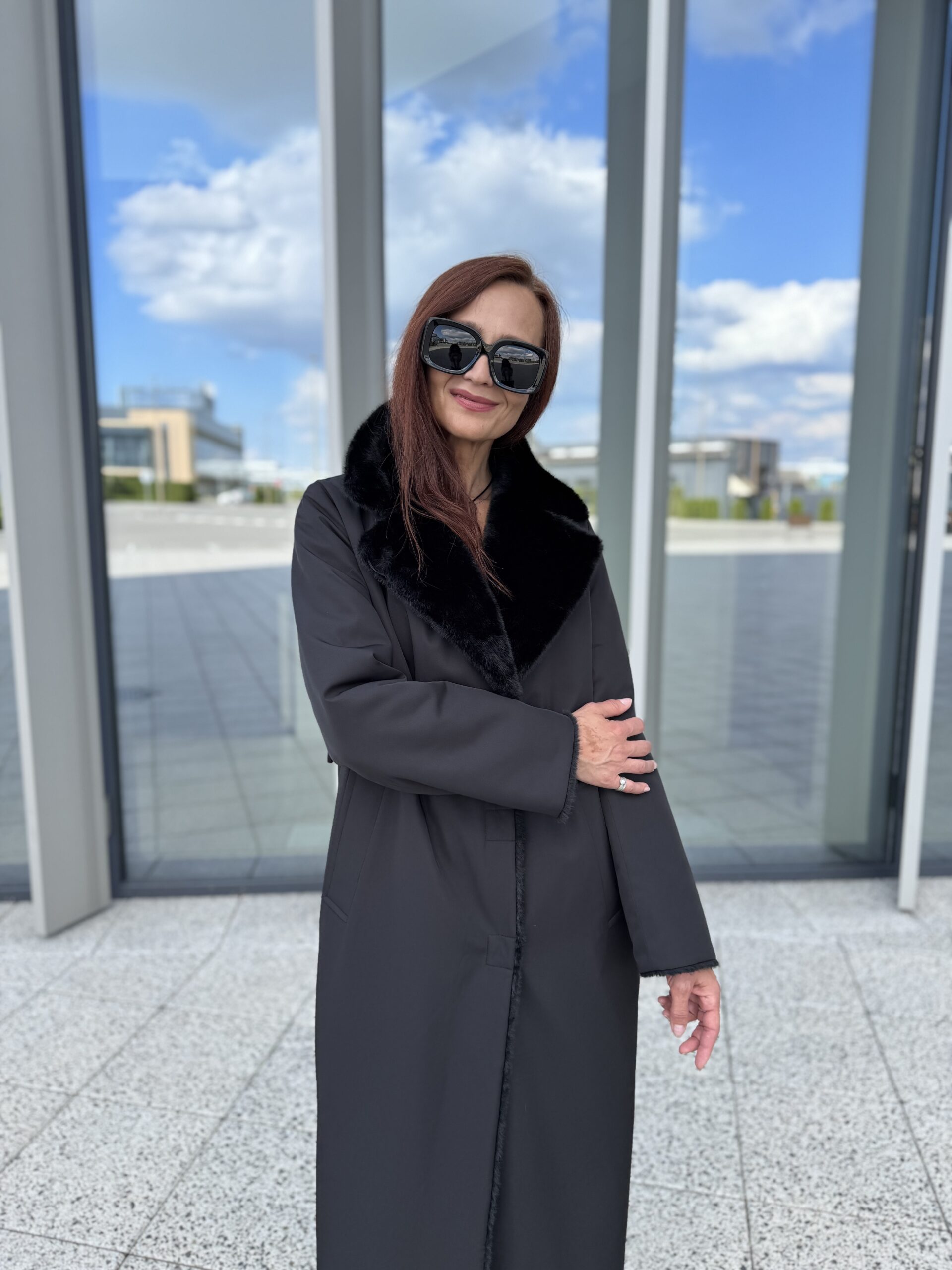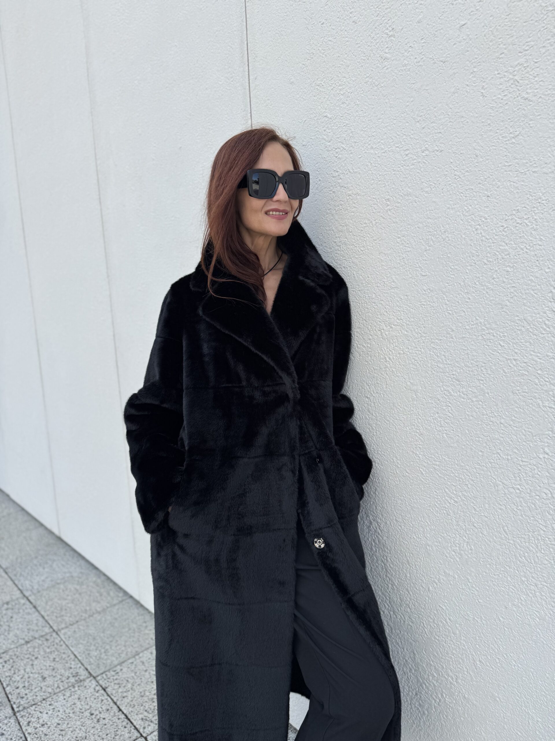 Пальто женское двухстороннее экомех, фактура норка, Модель 69613-2, цвет Черный