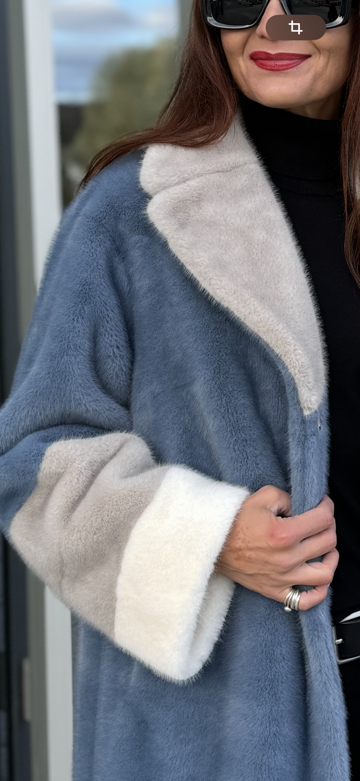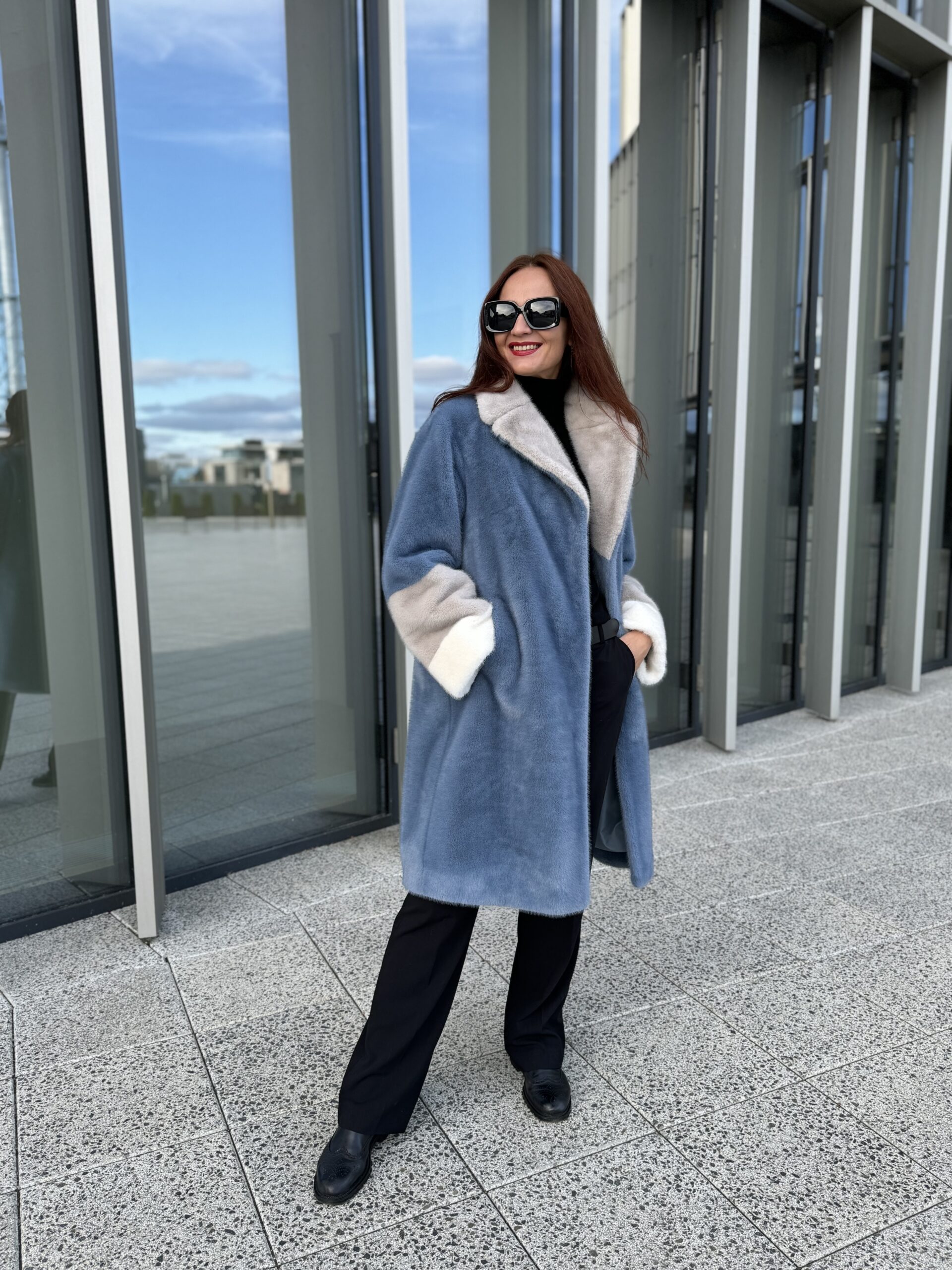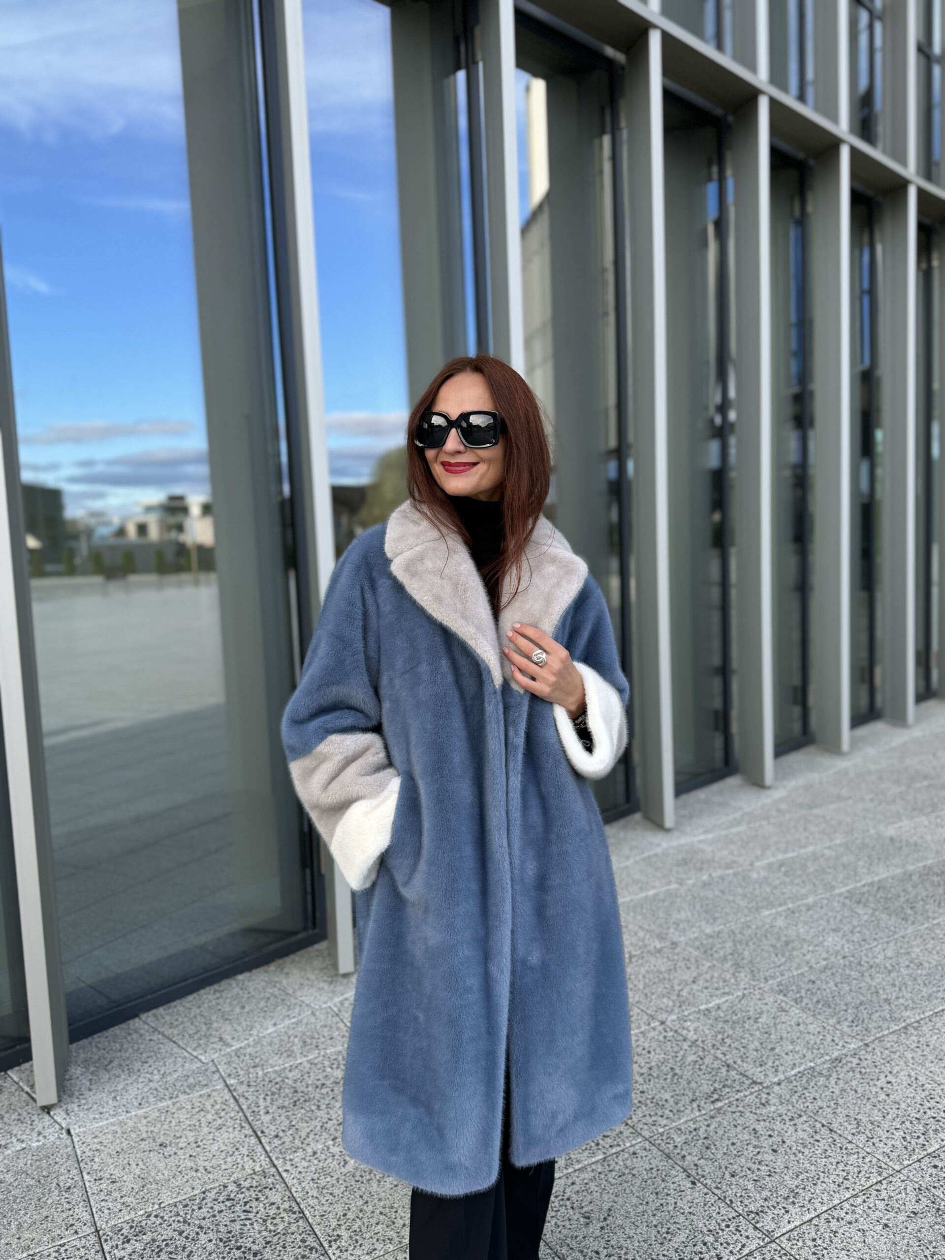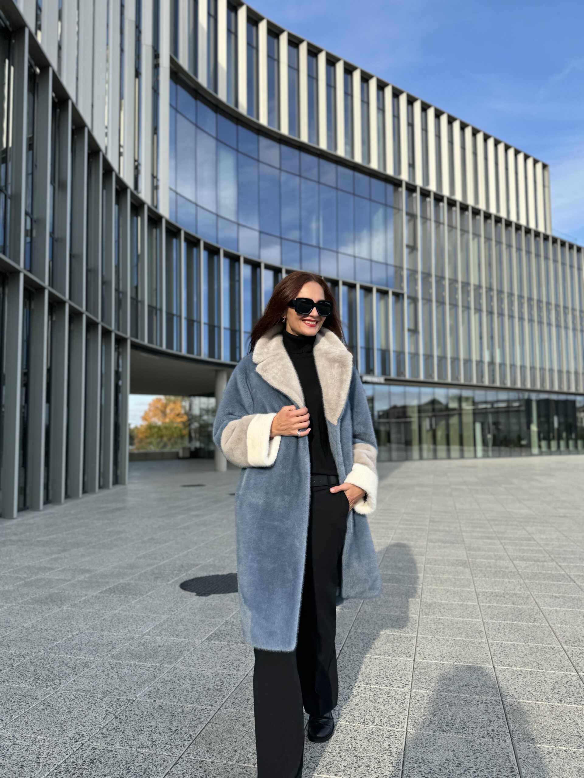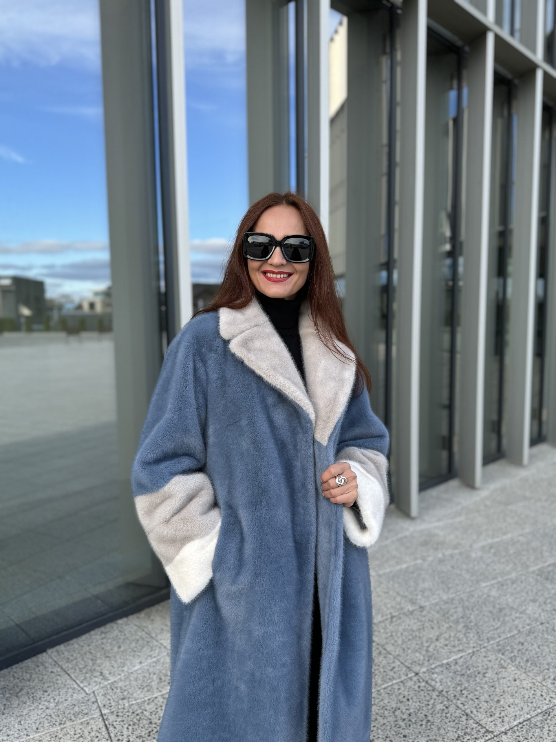 Пальто женское экомех, фактура норка, Модель 25101, цвет Голубой-серый-белый